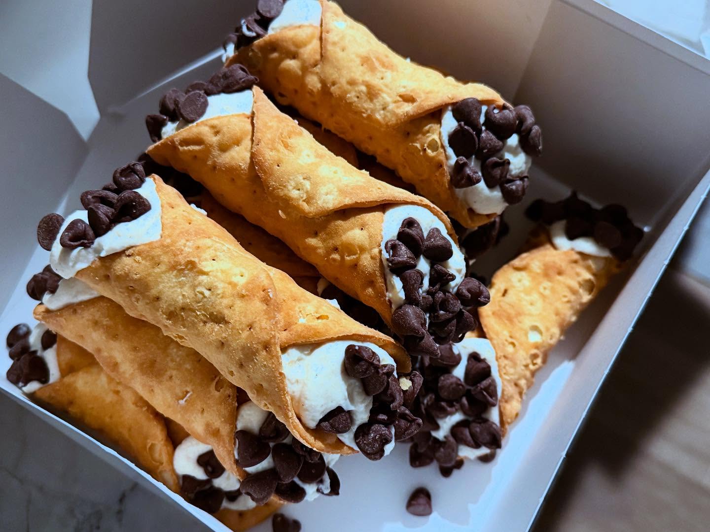 Homemade hard crunchy shell, homemade rich ricotta filling with chocolate chips coding the filling